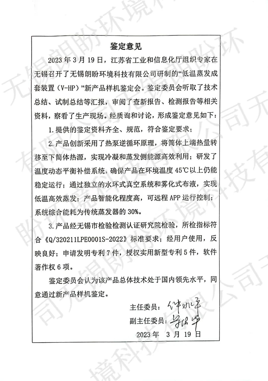 2023年03 月19日,江蘇省工業(yè)和信息化廳組織專家在無錫召開了無錫朗盼環(huán)境科技有限公司研制的“低溫蒸發(fā)成套裝置(V-HP)”、“低溫結(jié)晶成套裝置(V-CT)”新產(chǎn)品新技術(shù)鑒定會。鑒定委員會聽取了技術(shù)總結(jié)、試制總結(jié)等匯報(bào),審閱了查新報(bào)告、檢測報(bào)告等相關(guān)資料,察看了生產(chǎn)現(xiàn)場。