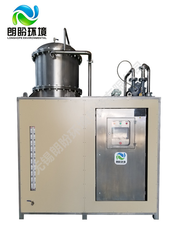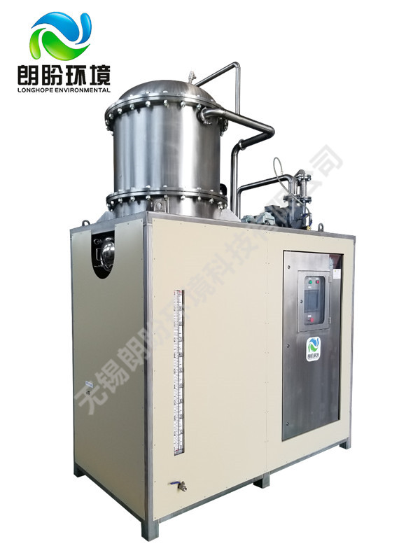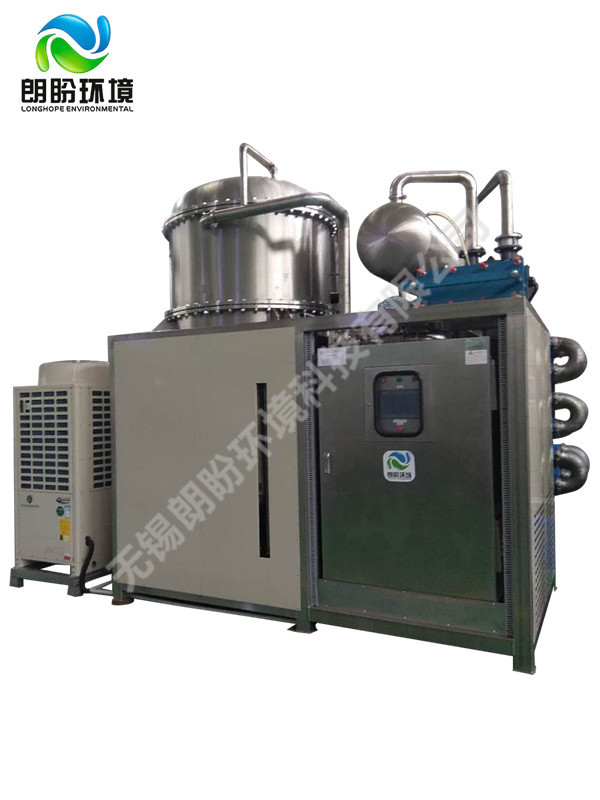 熱泵濃縮蒸發(fā)器的原理是物料的沸點(diǎn)隨著壓強(qiáng)的降低而降低。低溫節(jié)能濃縮設(shè)備整體保持真空狀態(tài),濃縮室的真空度約為95%~97%,在此壓強(qiáng)下水的沸點(diǎn)為35℃~37℃,系統(tǒng)無需配備進(jìn)料泵,利用蒸發(fā)室的負(fù)壓將物料吸進(jìn)蒸發(fā)室,通過強(qiáng)制循環(huán)方式將物料循環(huán)霧化,傳輸至換熱器上,物料中水分被蒸發(fā),物料連續(xù)循環(huán)霧化,通過蒸發(fā)室液位自動(dòng)補(bǔ)料,濃度達(dá)到要求后作為濃縮液排出設(shè)備。濃縮液一般粘度較大,需采用泵抽出。